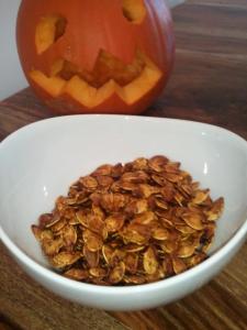 I, having grown up on a farm in a very food-oriented family, love, love, love to carve pumpkins–primarily as an excuse to extract and roast the delicious seeds.